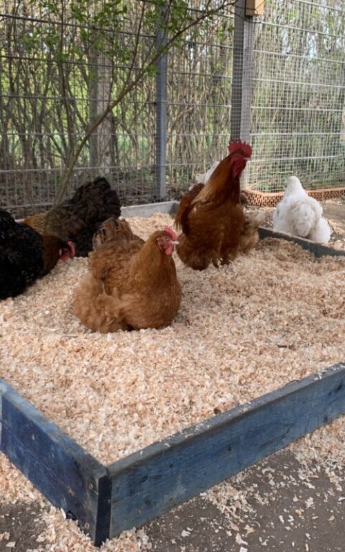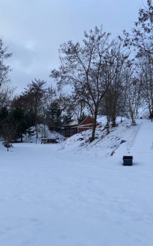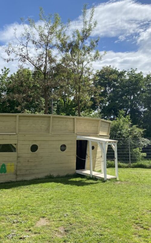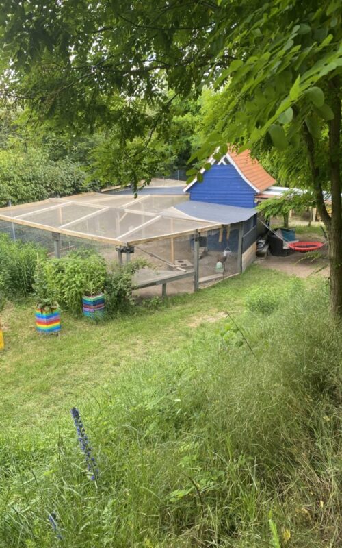 Im hinteren Bereich sind der Hüttenbaubereich, die Werkzeugausgabe, die Matschgrube und das Hühnerhaus mit Außengehege untergebracht.