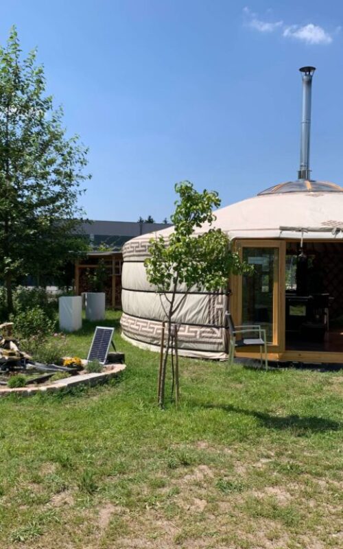 Gleich nebenan befindet sich eine beheizbare Jurte, mit Kochofen, Tischen, Bücher- und Spieleregalen und gemütlichen Sitzecken.