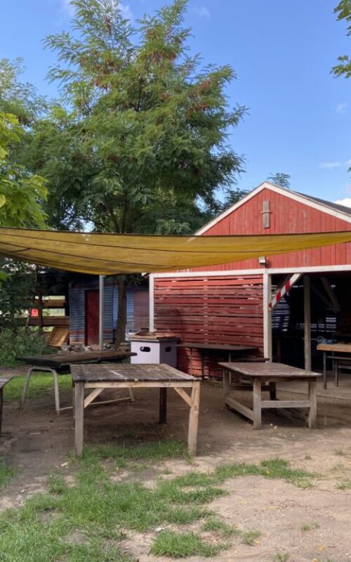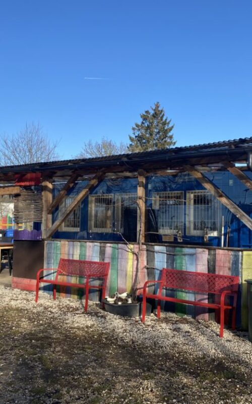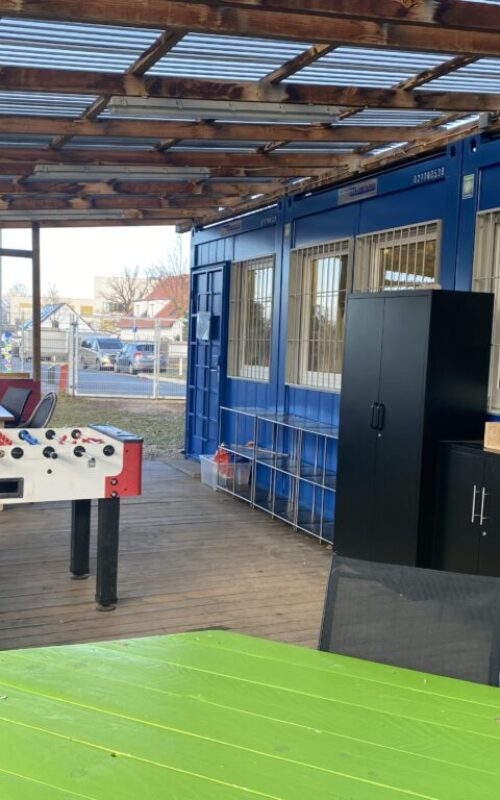 Im Eingangsbereich ist eine kleine Containeranlage mit sanitären Anlagen, einer Küchenzeile, einer Büroecke und Spiel- bzw. Basteltischen aufgestellt. Zusätzlichen Platz schafft eine angebaute, überdachte Terrasse mit offenen Regalen und Sitzgelegenheiten, sowie einem Kickertisch.